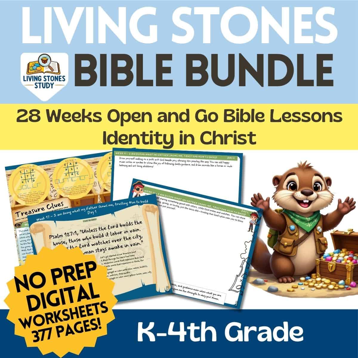 Christian homeschool Bible curriculum, Bible study for kids, children’s devotional, homeschool faith curriculum, identity in Christ Bible study, Christian homeschool printables, kids Bible journal, open and go Bible lessons, Living Stones study, Bible lessons for 1st–4th grade, 6-month Bible study, homeschool character building, Bible curriculum K–4.