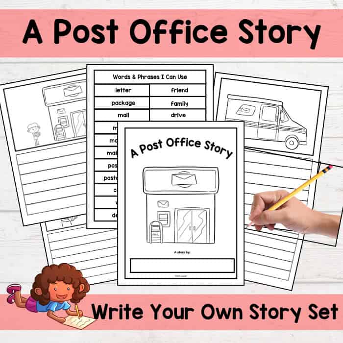 This set is all about a package being brought to the post office and delivered to a friend. Kids can color and add to the pictures too.