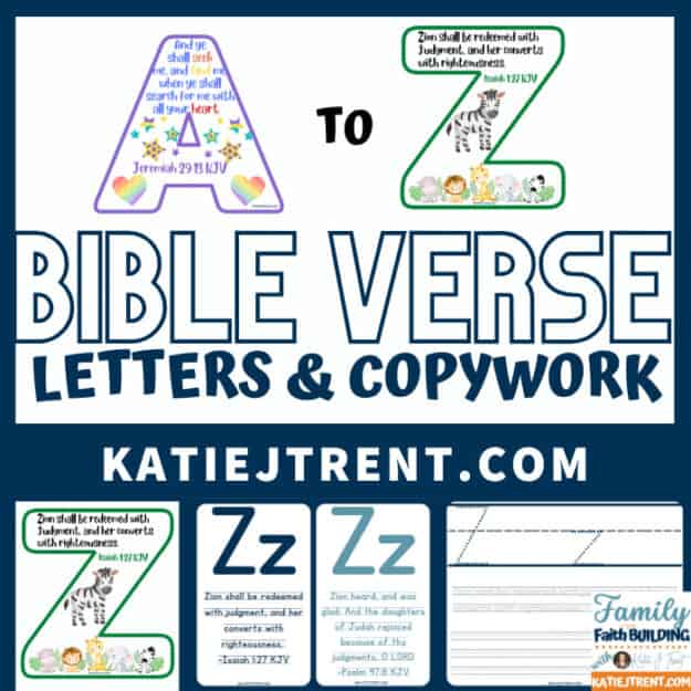 Memorize Scriptures from A – Z with whimsical letters, flashcards, & handwriting/copywork pages from Katie J Trent. Over 300+ pages, perfect for learning the alphabet, creating inspirational name signs, & more!