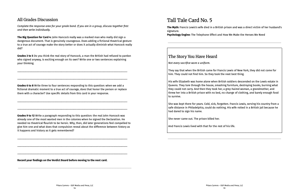 • 12 fully developed Tall Tale Cards covering: the “all signers lost everything” myth, Paul Revere, John Hart, John Hancock’s signature, Elizabeth Lewis, Richard Stockton, Caesar Rodney, Thomas Nelson Jr., the July 4 signing, Abraham Clark, Button Gwinnett, and the myth of founding unity