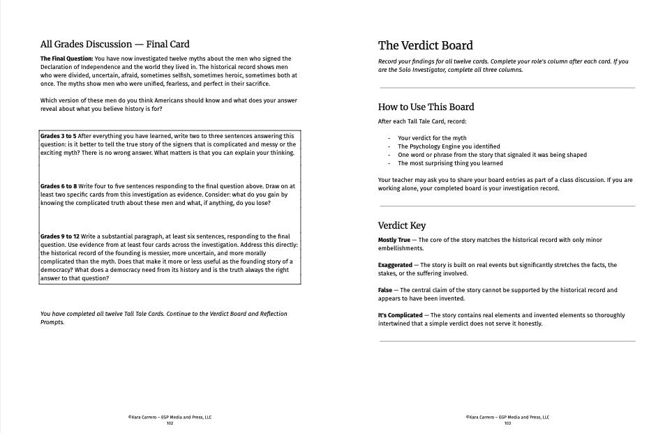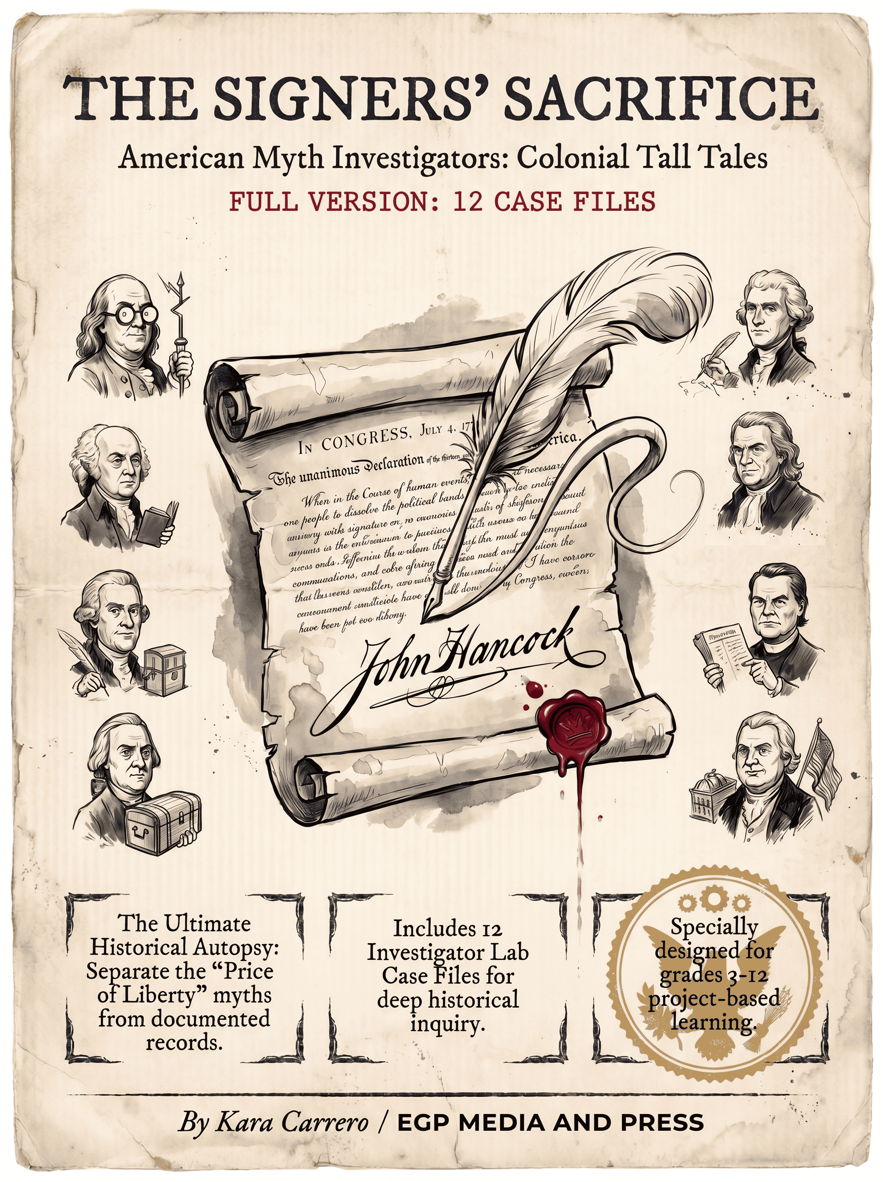 The Signers’ Sacrifice is a complete myth investigation activity for grades 3 through 12. Students take on one of three investigative roles: Detective, Psychologist, or Journalist. They will work through 12 Tall Tale Cards covering the most famous and most misunderstood stories of the founding era. Every card leads with the dramatic myth in a deliberate unreliable narrator voice, then presents the historical record, and then sends students into a role-specific investigation that asks not just what really happened but why we needed the story to be bigger than the truth.
