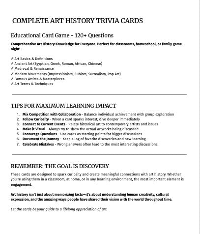Keywords: art history trivia, classroom activities, homeschool art curriculum, educational games, art teaching resources, trivia cards for kids, famous artists, art history lessons, no-prep teacher resources, homeschooling activities, visual arts education, creative learning, museum-inspired activities, art history games, teacher resources, homeschool printables.