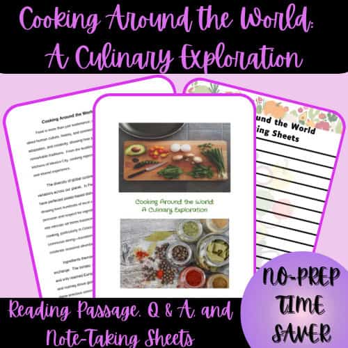 Embark on a global culinary journey with Cooking Around The World:  A Culinary Exploration, a comprehensive educational resource that transforms food studies into an engaging cross-cultural experience.  This thoughtfully crafted resource package invites students to explore how cooking traditions reflect human history, cultural identity, and global interconnectedness.  Through a professional-quality reading passage, targeted comprehension questions, interactive activities, and structured note-taking opportunities, learners will discover the fascinating stories behind global cuisines.  The materials are designed to enhance reading comprehension while simultaneously building cultural awareness and appreciation for diverse culinary traditions.
