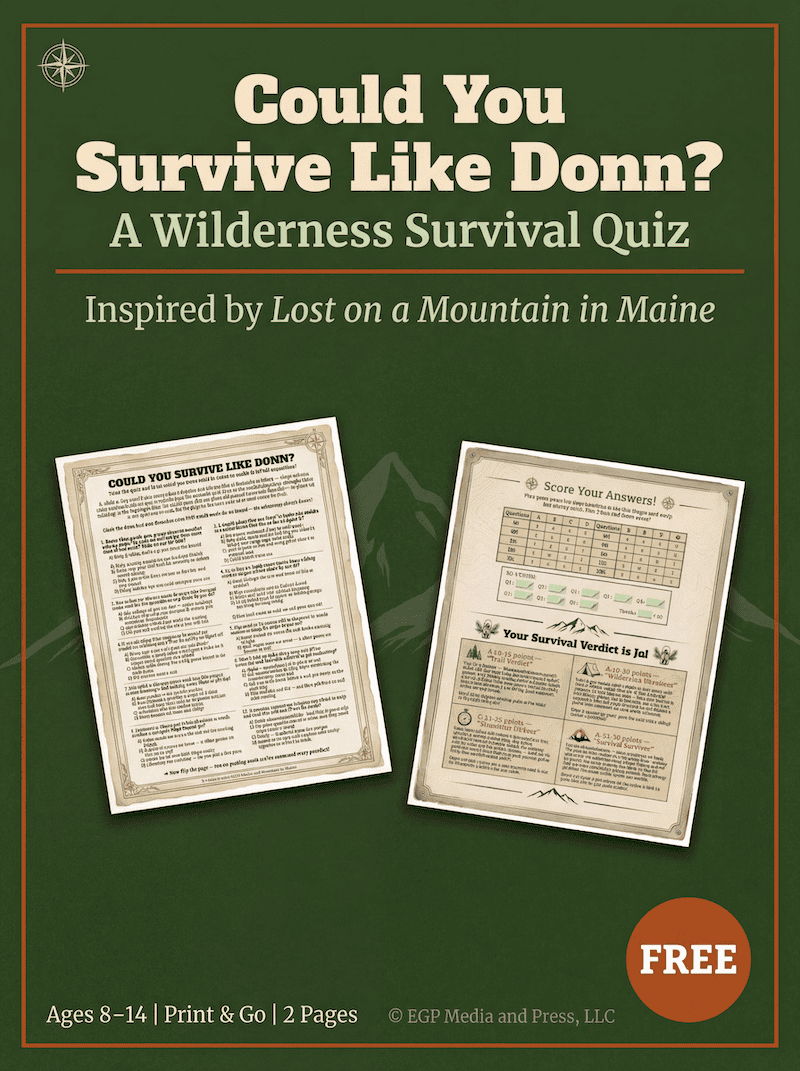 This FREE 2-page printable quiz puts kids ages 8–14 in Donn’s shoes with 10 real wilderness survival scenarios inspired by the beloved classic Lost on a Mountain in Maine. It’s the perfect warm-up activity before starting the book, a fun family challenge, or a can’t-miss introduction to a full novel study unit.