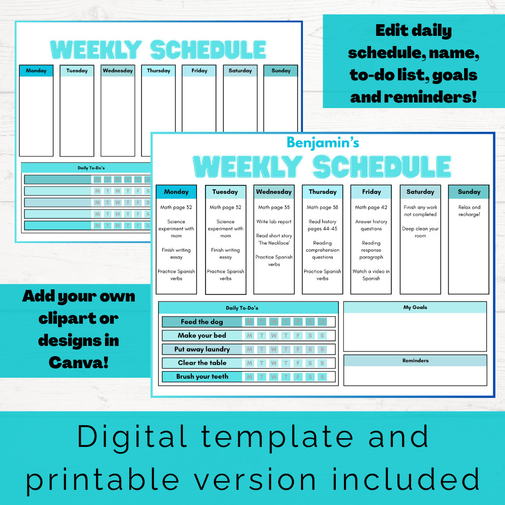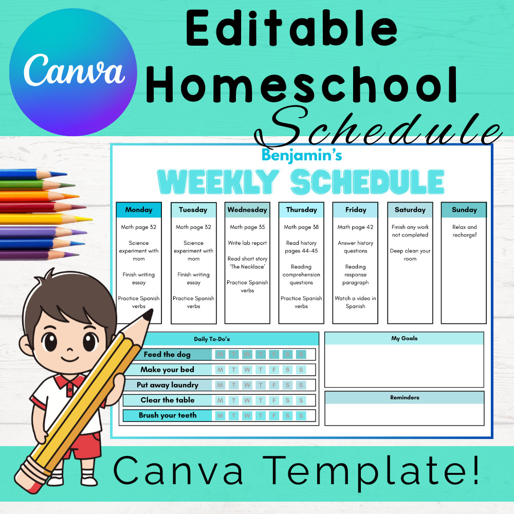 Editable Blue Homeschool Schedule Template for Kids | Weekly Planner | Assignments, Chores, Goals & Reminders | Printable & Canva Editable