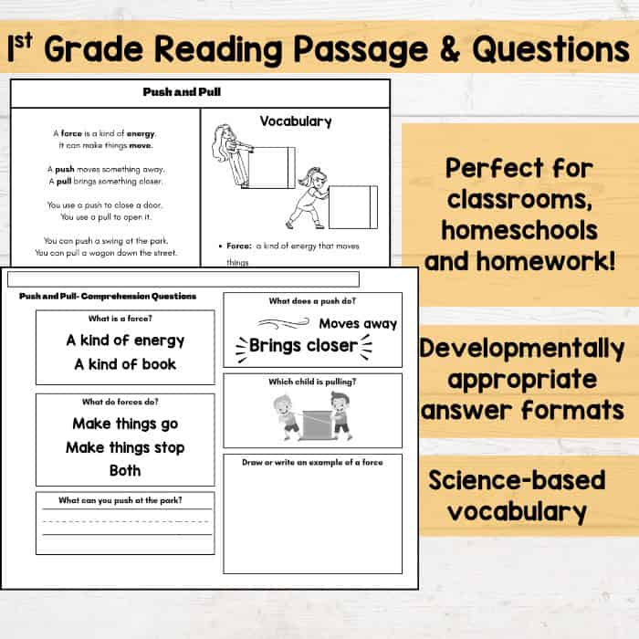 First Grade Reading Comprehension: Push and Pull Forces for Reading Comprehension Vocabulary and Science Units