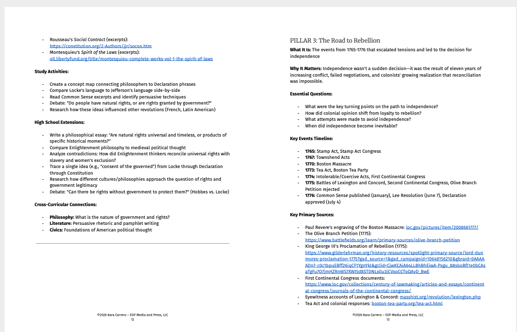 Note: This is a teaching framework and implementation guide. For complete ready-to-use lessons for each pillar, explore our Revolutionary America curriculum collection