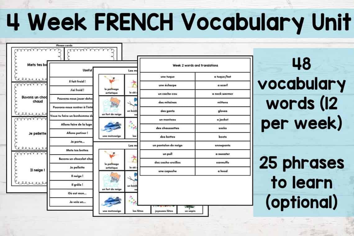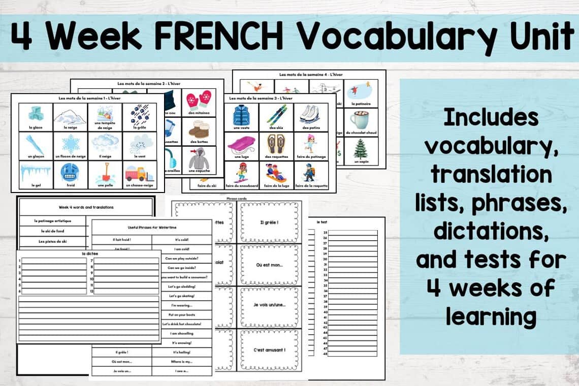 French Winter Vocabulary Unit: 4 Weeks of Words, Sentences and Tests