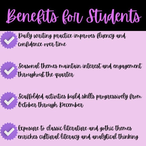As a homeschool mom to a 9th grader, I know how challenging it can be to start each ELA lesson with purpose and engagement. That is why I created this comprehensive quarter bundle of daily bell ringers that will transform your language arts routine from October through December. These are not just busy work activities—they are carefully crafted warm-ups that build essential writing, grammar, and literary analysis skills while keeping students engaged with seasonal themes and gothic literature elements. Whether you are teaching at home or in a classroom, these ready-to-use prompts will give you confidence and your students the daily practice they need to excel.