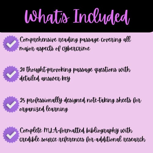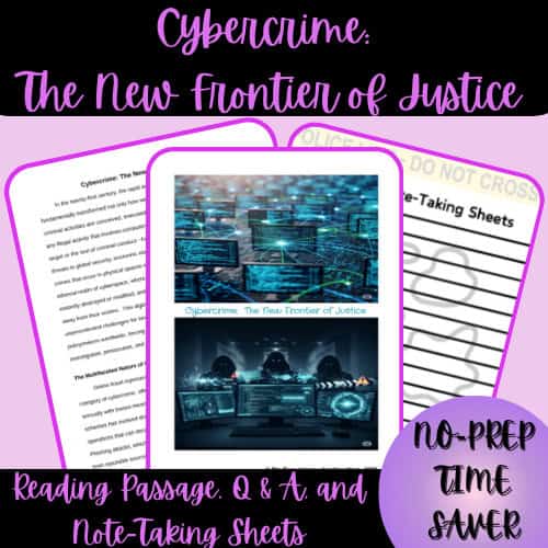 Complete cybercrime educational package featuring in-depth reading material, thought-provoking questions, and structured note-taking sheets for high school and college-level learning.