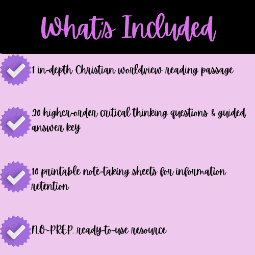 The note-taking sheets in this set are carefully designed to help students/homeschoolers engage actively and independently with the passage.  They encourage students/homeschoolers to track key ideas, summarize concepts, and connect scriptural truths to what they’re learning.  Each sheet includes prompts for reflection, biblical cross-references, and personal insight—helping students/homeschoolers move beyond memorization into personal application.  The structure supports higher-level reading comprehension and organization while keeping faith at the center.  Teens can highlight main ideas, jot connections between culture and Christianity, and even write personal prayers or reflections as they learn.  For homeschool portfolios, these pages also provide tangible evidence of critical engagement and growth in worldview understanding.  They make the learning process interactive, intentional, and spiritually grounded.