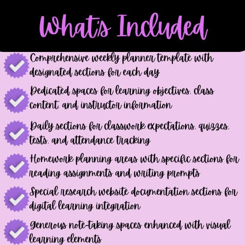 • Daily sections for classwork expectations, quizzes, tests, and attendance tracking