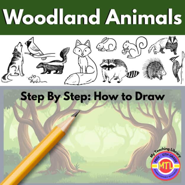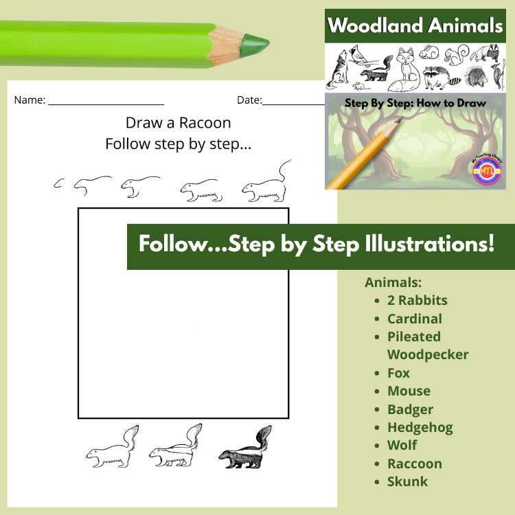 Students will love to learn how to draw, step by step these woodland animals: 2 rabbits, cardinal, pileated woodpecker, fox, mouse, badger, hedgehog, wolf, raccoon and skunk.