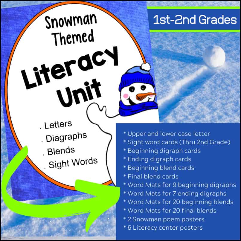 This Snowman Literacy resource focuses on letters, digraphs, blends and sight words and can be used in a variety of ways in your classroom and your LITERACY centers!