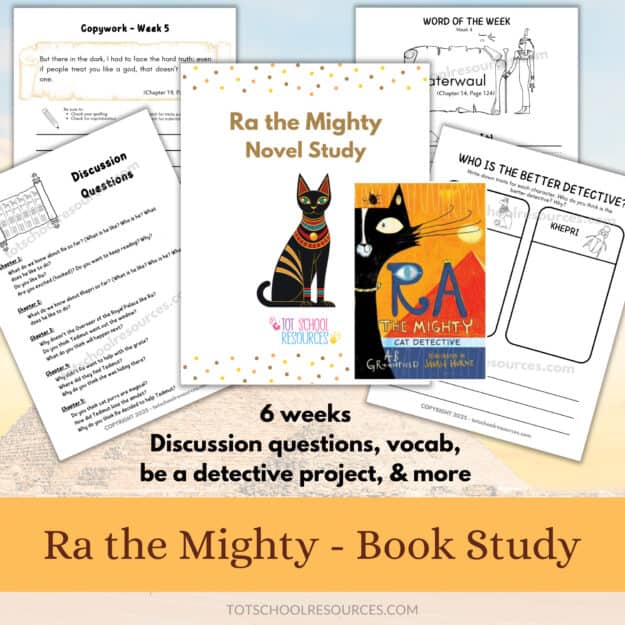 Kids will love this book or novel study of Ra the Mighty, which is set in Ancient Egypt. This study includes discussion questions, a detective project, as well as options for vocabulary and copywork practice.