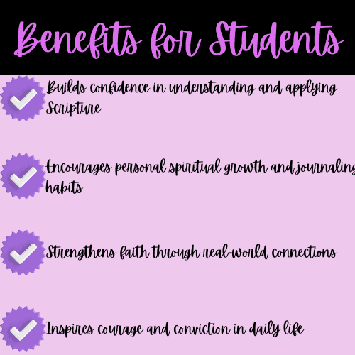 Each section of this study was written with the heart of a parent who wants Scripture to come alive for her child.  The lessons are broken down in a way that encourages students to truly engage—not just read the verses but think about what they mean and how they apply to their everyday lives.  Discussion questions prompt honest, real-world reflections, helping students/homeschoolers bridge faith and life with confidence.  The flexible structure allows you to use this guide over several weeks or adapt it to your own family’s rhythm.  It is a resource that fosters independence in spiritual study while still nurturing that parent-child connection we treasure so deeply in homeschooling.