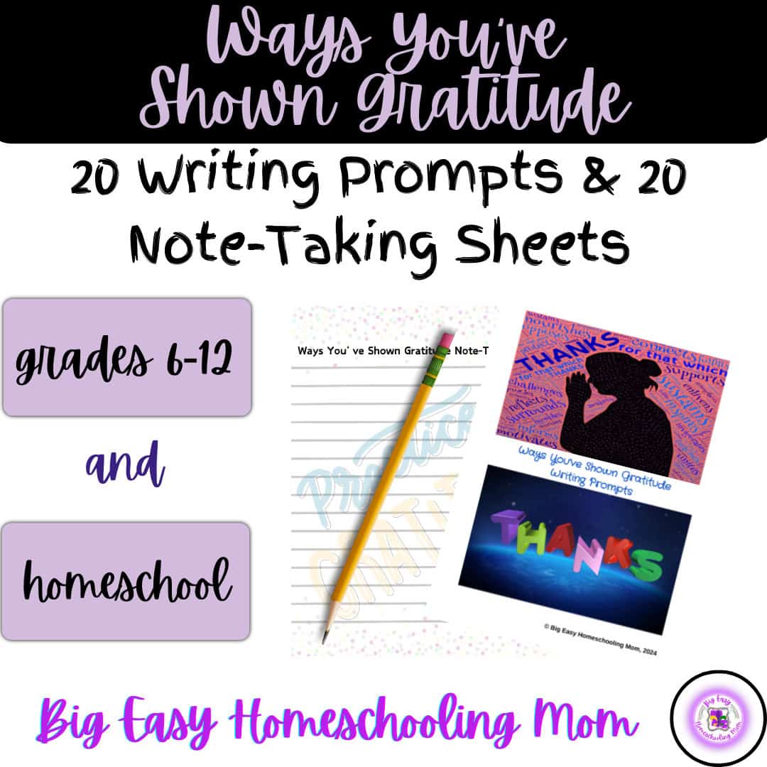 Inspire gratitude and enhance writing skills with our Ways You’ve Shown Gratitude: 20 Writing Prompts & 20 Note-Taking Sheets.  Perfect for middle to high school students.