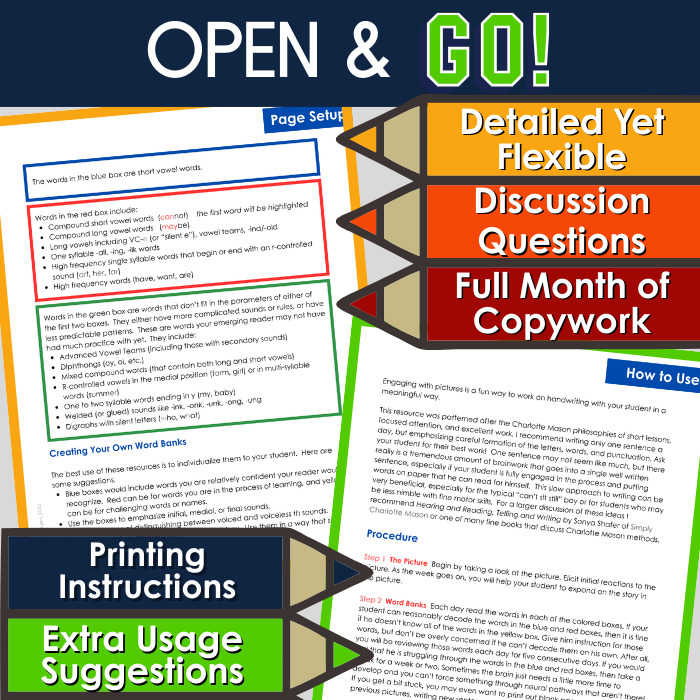 Transform handwriting lessons into meaningful, focused activities with this picture-based Charlotte Mason-inspired resource. Short, daily lessons and discussion prompts foster a relaxed environment, while focused word banks and visual phoneme…
